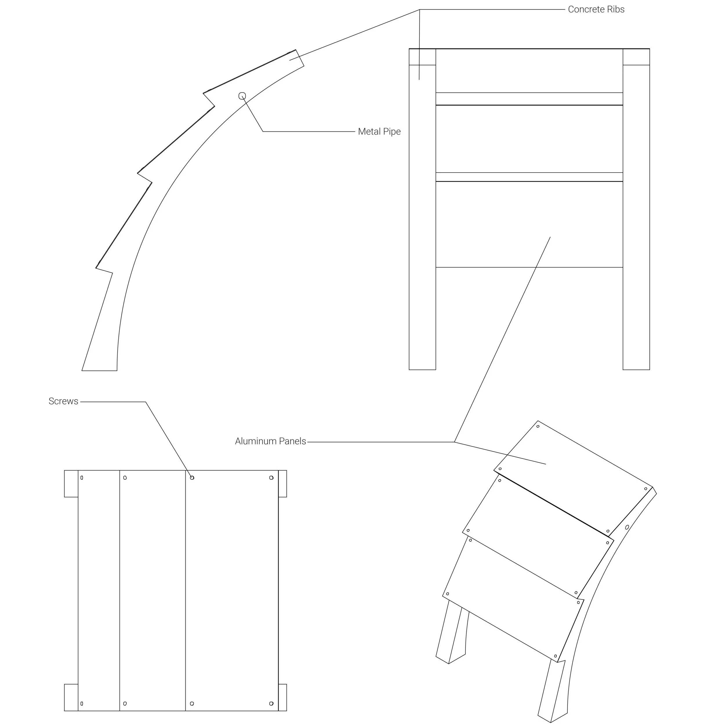 A full-scale mockup of a studied detail from The Sydney Opera House focused on the structural components and shell-like facade to explore the curvature, water resistance, and sunlight reflection. The detail was constructed using a personalized ratio of aggregate and cement, aluminum sheets, wood for molding, screws, and a metal pipe.